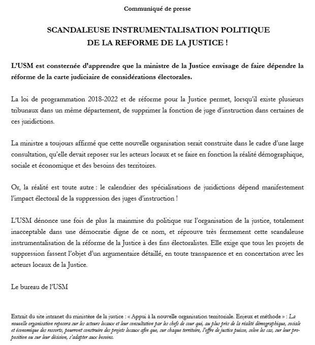 L’IUSM (Union syndicale des magistrats, majoritaire) a dénoncé dans un communiqué “la mainmise du politique sur… l’organisation de la justice, totalement inacceptable dans une… démocratie digne de ce nom”, et pilonné une “scandaleuse instrumentalisation de la réforme de la Justice à des fins électoralistes”. L’USM “exige” par conséquent “que tous les projets de suppression fassent l’objet d’un argumentaire détaillé, en toute transparence et en… concertation avec les acteurs locaux de la Justice”.