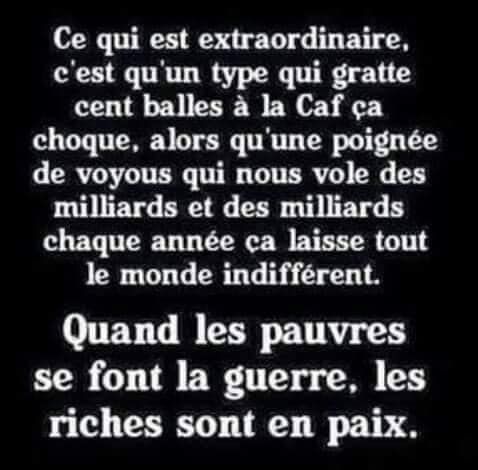trouvez, aussi, un complément à cette réflexion sur le site internet à téléchargements gratuits http://www.freethewords.org/, onglet 3 "Nul n'est nul", "Légalité de l'égalité" (Quality of eQuality), "La démagogie n'est utile et utilisée que par qui est déjà au pouvoir" et onglet 4 "L'anticommunication comment ça fonctionne ?» et "Why do we left the left wings ?" ; onglet 2 "L'ardeur sociale", "Comment devenir un (e) athée du capitalisme" et "LE ROMAN DE L' ÉCONOMIE " ; et, surtout, RIEN DE PLUS SOLIDE QUE LE SOLIDAIRE sur l’onglet 3, ainsi que LA QUESTE DES QUESTIONS (Qui a démuni les démunis ? Qui a déshérité les déshérités ? Qui s'est emparés des désemparés ? Qui a détressé les détresses ? Qui a dérobé aux nécessiteux leur nécessité ? S’il y a fraudes pourquoi donc cacher les fraudés qui les subissent ? S'il y a faim c'est qu'il y a, d’abord, affameurs ? S’il y a endettés, ils sont toujours précédés des endetteurs. Pas de travailleur clandestin qui n’ait été créé par l’argent clandestin. Et sans capital au noir pas de travail au noir, etc. Tout se tient et les causes ne pourront plus échapper à l’implacabilité de la logique. Le règne moral des trop riches vient de s’effondrer), onglet 2.