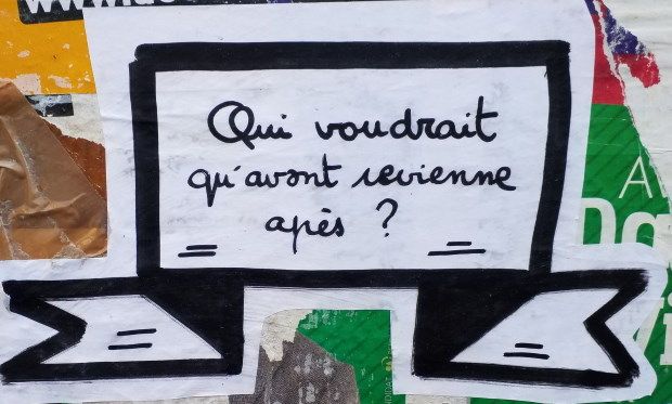 La sortie, la belle, l’évasion, la quille, le flot de mots à dire. Les nouveaux points de vue, la fin d’un temps. Tout ceci appelle des explications pas encore bien rodées. Des précautions ou des impatiences. En tout cas, des projets plein la hotte…Il ne faudrait pas, alors, que l’envahissement des pouvoirs grandisse plus. Nous devons nous réacclimater à tant de choses…et du nouveau il y en a tant : ne serait-ce que ce dont nous avions l’habitude, peut-être, mais qui se présente, ici, d’une manière jamais encore pensée, ressentie et expérimentée…Comment vivre la « résilience alimentaire », la fin de la prééminence devenue absurde de Paris, la nouvelle distribution des valeurs (les utiles à la société dépassant de loin les prédateurs de l’argent fou) et quelques autres interrogations inédites !
